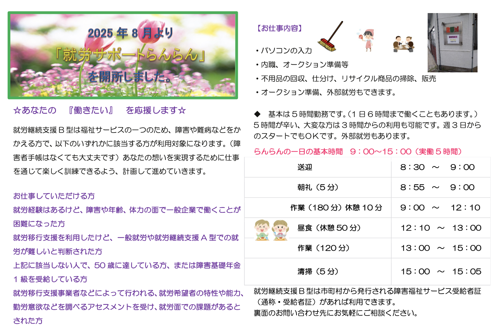 らんらんは、就労継続支援B型事業所なので、一般就労が難しい障害や体調のある方で、年齢制限がなく(15歳以上であれば可)、A型のように雇用契約が難しい人も、生活リズムを整える」「作業スキルを身につける」ステップになり、無理せず段階的に進めます。基本は5時間勤務です。(1日6時間まで働くこともあります。)
