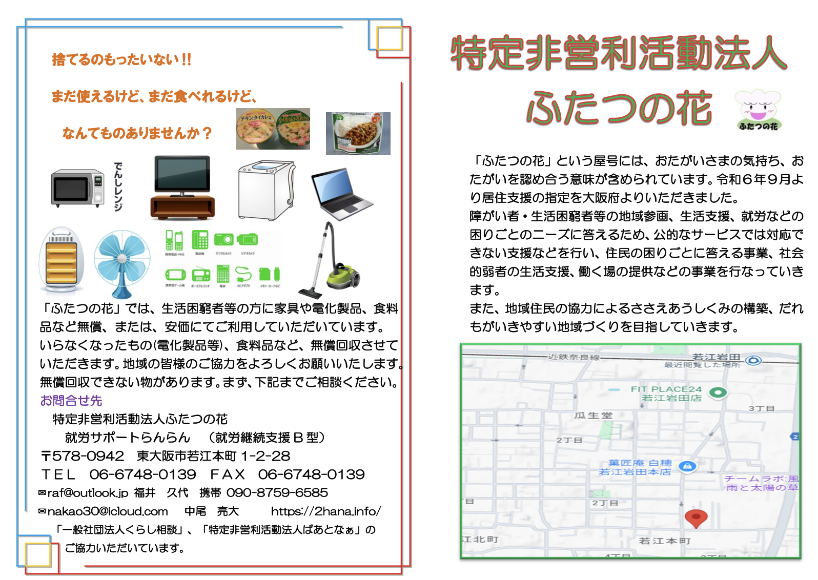 『ふたつの花』という屋号には、おたがいさま、という気持ちが込められていて、地域住民の協力によるささえあうしくみの構築、だれもがいきやすい地域づくりを目指しています。